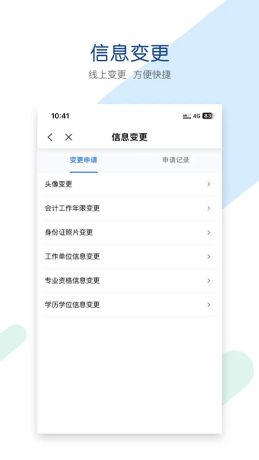该应用可为会计人员提供便捷的信息采集,信息变更,主要功能包括:会计人员信息采集,信息变更,人员调转,信息查询,学分折算,查看申请记录等功能。