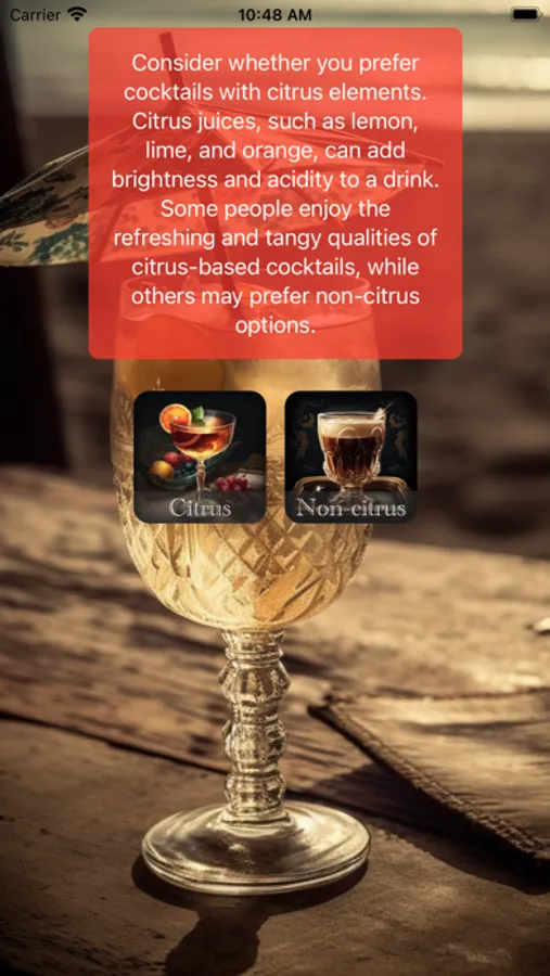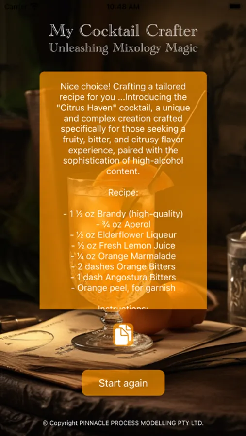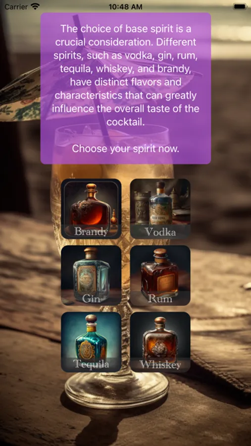 Once you've chosen your base spirit, My Cocktail Crafter, whisks you away to a world of limitless possibilities. With a few simple taps, the app generates a completely novel cocktail recipe tailored specifically to your chosen base spirit.
