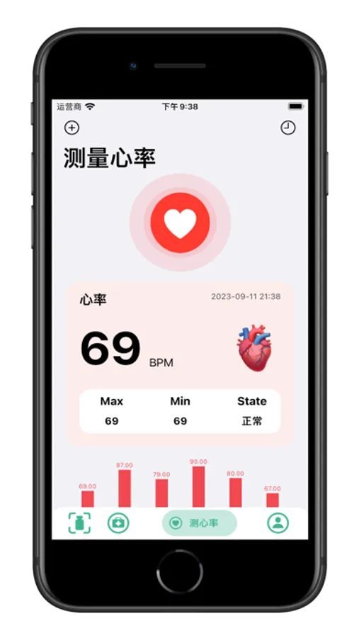 【监测心率功能 - 心率检测:只需要将你的手指放在摄像头和闪光灯上就可以监测到你的心率。iPhone 也成为一台可视化的健康检测仪,随时随地可以测量、记录心率,了解你的身体健康状态,以便调整运动量】
