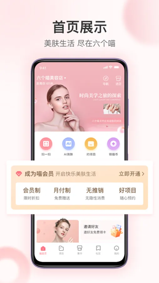 六个喵是美容护肤赋能品牌,线采用“会员制”,“月付制”、“智能化”、“全程无推销”的美业商家模式,线上采用项目购买,预约下单的方式进行售卖,六个喵社区用来用户分享使用心得视频、图文分享的的板块,用户可以通过上传视频和图文,其他用户可以进行评论、点赞、收藏等功能。