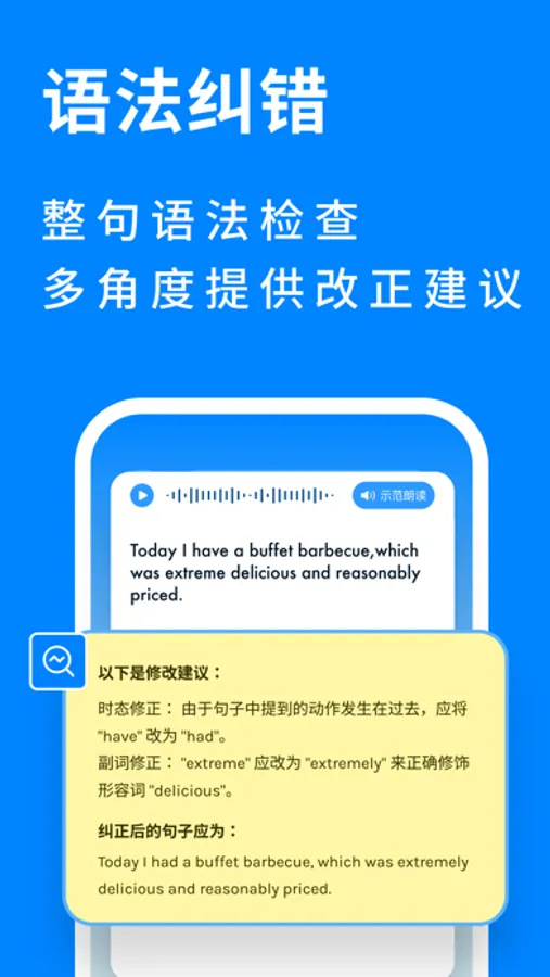 整句语法检查,多角度解答语法使用情况及改正建议,让表达更加自然地道。