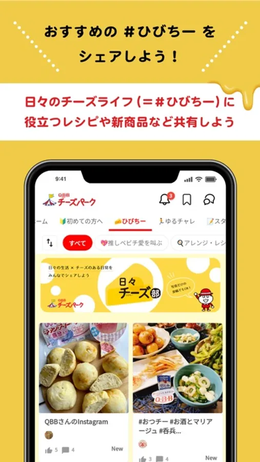 日々のチーズライフ(=ひびちー)に役立つレシピや新商品情報などを、メンバー同士で気軽に投稿、いいね、コメントすることで、心と体のサポートにも役立つ情報を、交換し合うことができます。