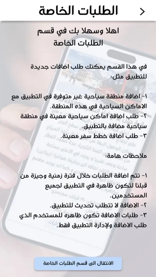 - المشاركة في طلبات اضافات جديدة للتطبيق كمناطق سياحية جديدة، اماكن سياحية جديدة، دول جديدة