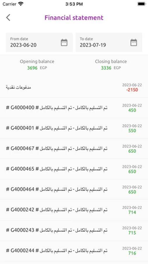 • كشف حساب العميل به تفاصيل المعاملات المالية