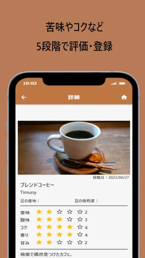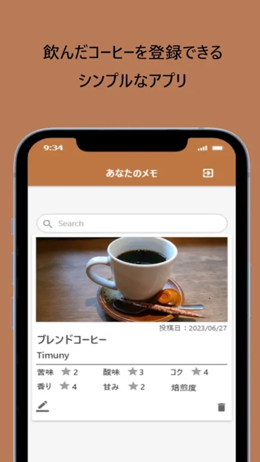 飲んだコーヒーを簡単登録できるシンプルなアプリです。店名や苦味・コクなど詳細情報も登録可能。