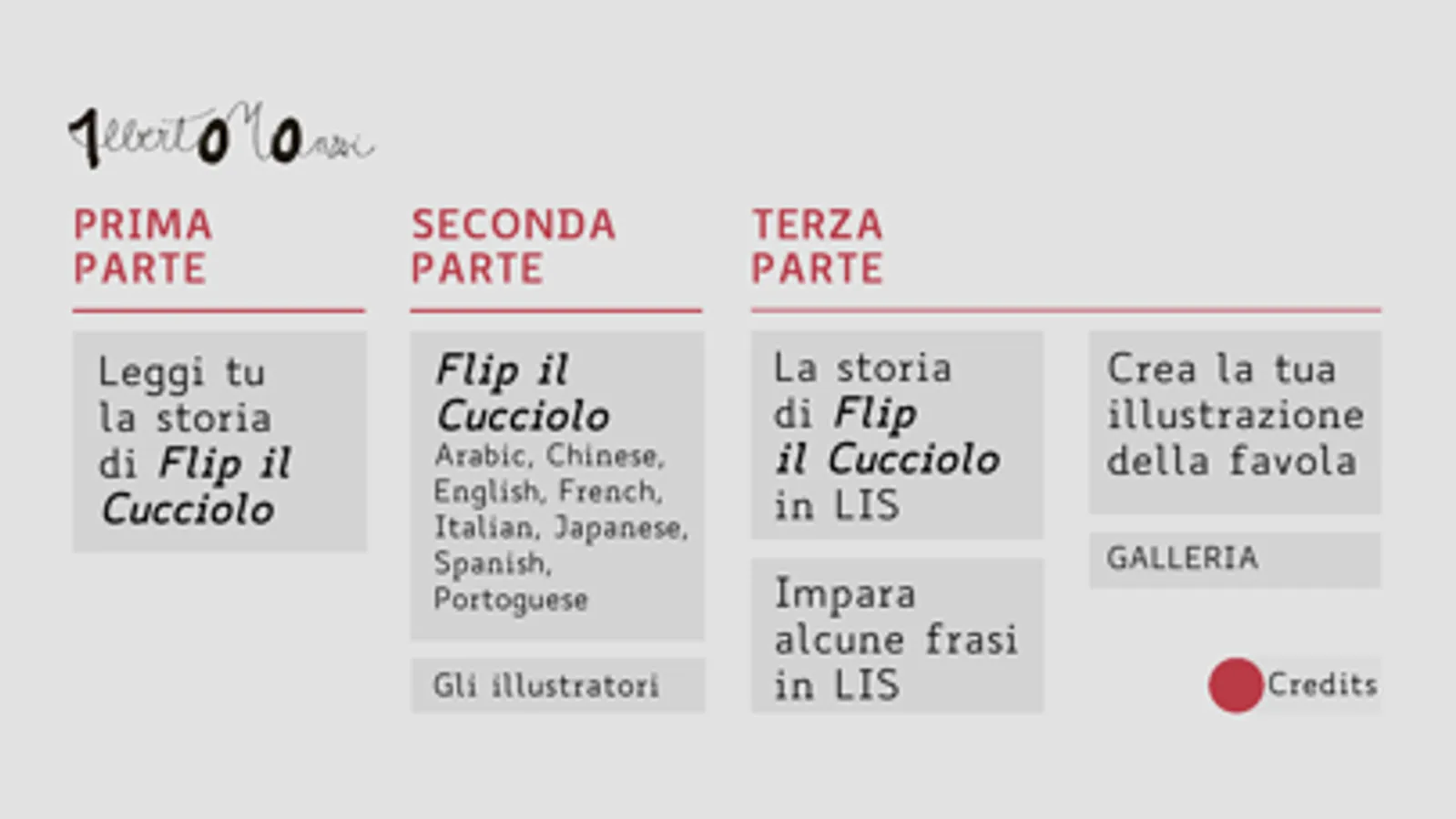 Scopri le vicende di Flip il cucciolo nelle sue varie versioni. Esplora la Parte 1 e interagisci con fantastiche animazioni. Leggi la Parte 2 per svelare magnifiche illustrazioni. Avventurati nella Parte 3 per scoprire la storia in LIS e per dare vita alle tue creazioni.