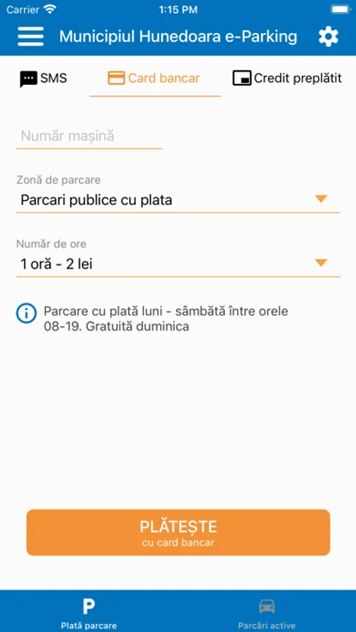 "Municipiul Hunedoara e-Parking" este o aplicație oficială a Primăriei Municipiului Hunedoara. Aplicația permite achitarea tarifelor pentru utilizarea ocazională a parcărilor publice.