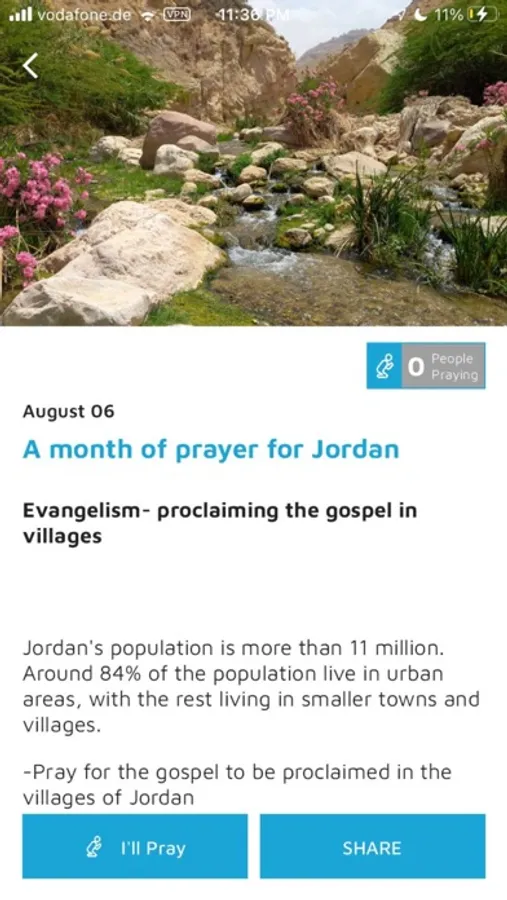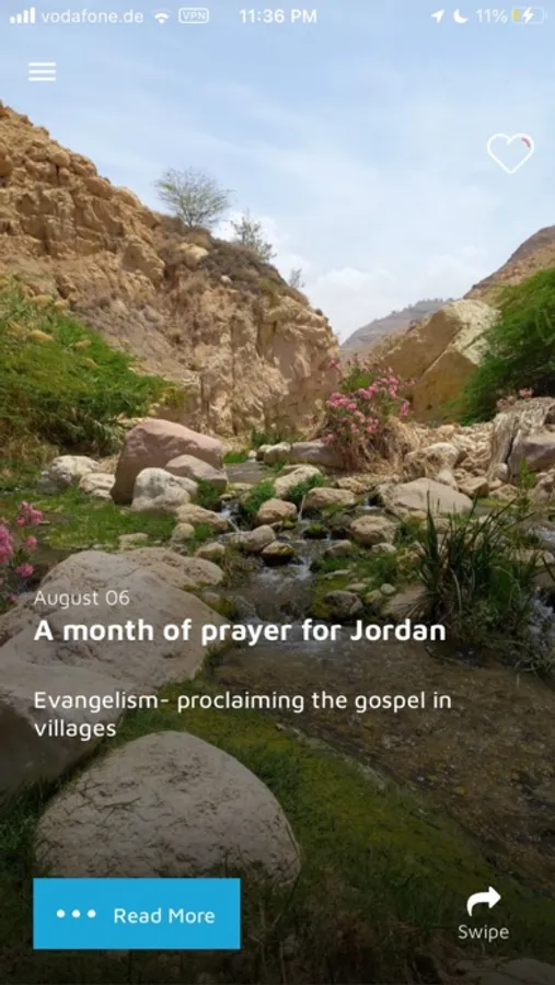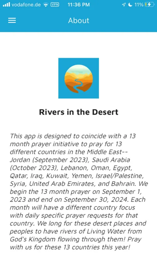 This app is designed to coincide with a 13 month prayer initiative to pray for 13 different countries in the Middle East--Jordan (September 2023), Saudi Arabia (October 2023), Lebanon, Oman, Egypt, Qatar, Iraq, Kuwait, Yemen, Israel/Palestine, Syria, United Arab Emirates, and Bahrain. We begin the 13 month prayer on September 1, 2023 and end on September 30, 2024. Each month will have a different country focus with daily specific prayer requests for that country. We long for these desert places and peoples to have rivers of Living Water from God's Kingdom flowing through them! Pray with us for these 13 countries this year!