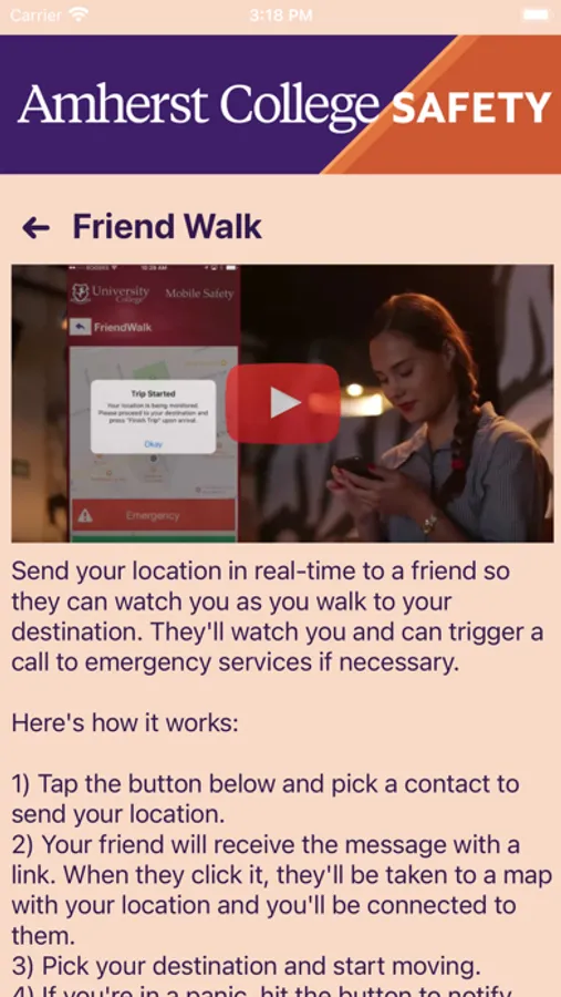 - Friend Walk: Send your location to a friend through email or SMS on your device. Once the friend accepts the Friend Walk request, the user picks their destination and their friend tracks their location in real time; they can keep an eye on them to make sure they make it safely to their destination.