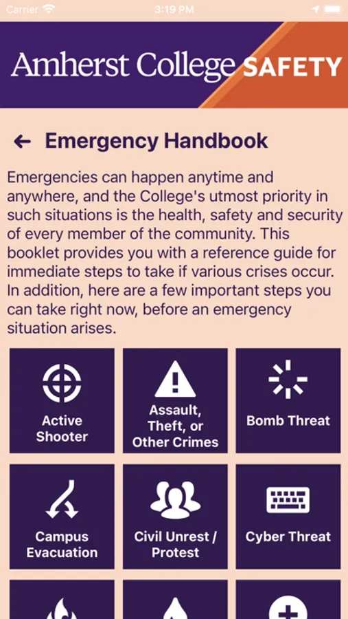 - Emergency Handbook: Campus emergency documentation that can prepare you for disasters or emergencies. This can be accessed even when users aren’t connected to Wi-Fi or cellular data.