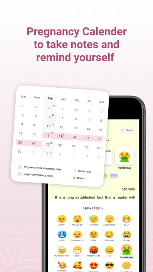 Calendar: Includes facilities like marking the LMP date, making individual notes on a date, creating reminders, choosing theme colours, adding additional emojis, and what else you need.