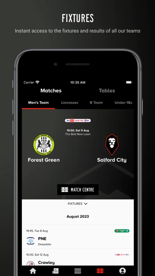 - Fixtures & Results: Use the app to keep up to date with upcoming matches and recent results.