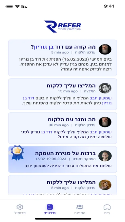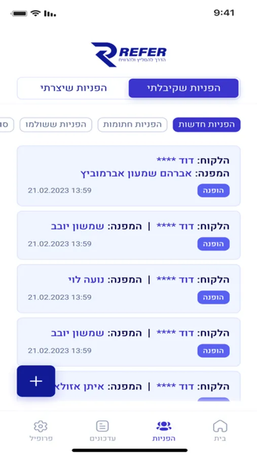 אפליקציית REFER – פתרון מהפכני שמשנה את תחום ההמלצות בין ממליצים לבין בתי עסק ונותני שירותים. האפליקציה מהווה פלטפורמת התקשרות חכמה בין הצדדים שמבטלת את המבוכה וחוסר הידע של ממליצים בנוגע לדרך קבלת התגמול על המלצה שהובילה לעסקה. לאחר רישום מהיר וחד פעמי לאפליקציה, הממליץ או בית העסק יוכל להציע עמלת תיווך לצד השני, וזאת על יד חוזה קל וידידותי אך מחייב שייחתם באופן מקוון בין שני הצדדים. עם REFER, תוכל להמליץ ולהרוויח מכל שידוך עסקי ולקבל את העמלה במספר דרכים שתסוכם מראש עם בית העסק. תוכל לבחור אחוז מסוים מהעסקה, סכום קבוע או אפילו לסגור מראש שאת העמלה יתרום בעל העסק למטרה טובה, כמו יד שרה. צוות REFER עומד לרשותך בכל רגע ומעניק שירות מקיף לכל השאלות כדי לייצר לך חוויית חיבור פשוטה ונוחה כדי שכולם ירוויחו. REFER – פשוט להמליץ – קל להרוויח.