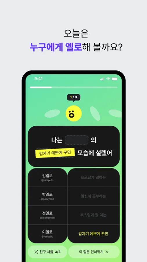 - Skip 기능을 통해 투표하기 어렵거나 부담스러운 질문은 건너뛸 수 있어요