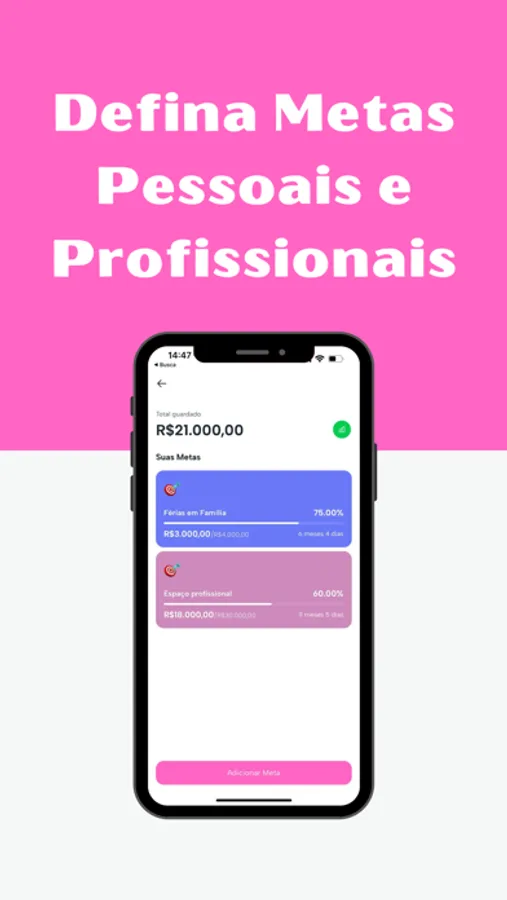 Para estimular o crescimento pessoal e profissional, o aplicativo oferece a possibilidade de criar "Metas Pessoais e Profissionais". Você poderá definir objetivos para a sua família e para o seu negócio. O aplicativo acompanha o progresso em direção a essas metas, incentivando seu planejamento financeiro.