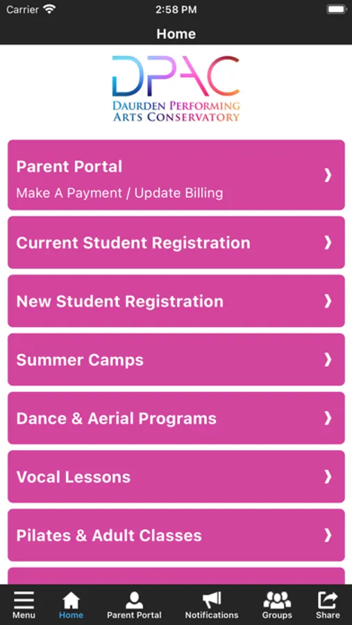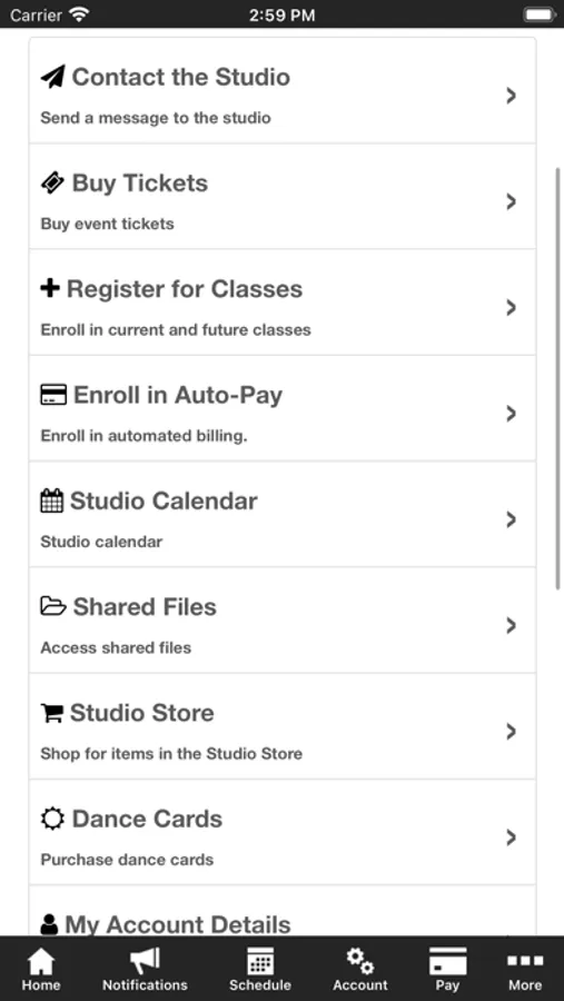 The app makes it easy to receive notifications about auditions, live classes and upcoming events