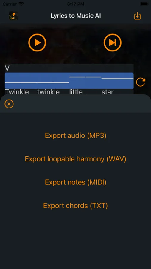 Export as an audio file, loopable harmony file, multitrack MIDI file, or chord notation