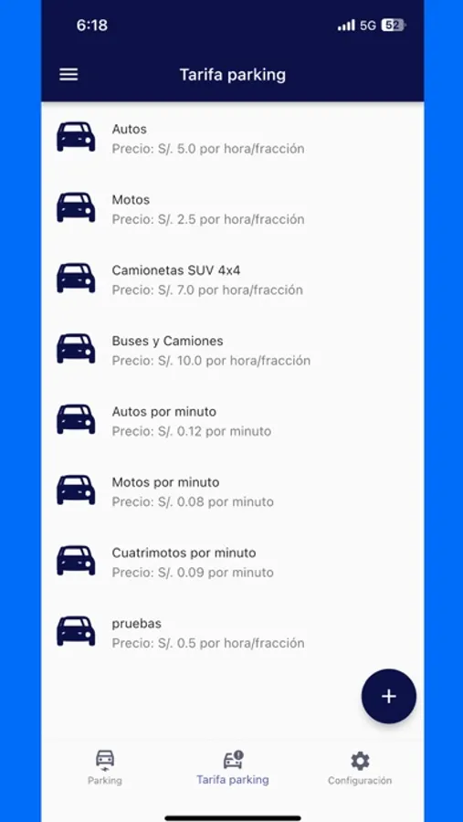 Escoger la tarifa de parqueo según el tipo de vehículo (Auto, moto, camión, etc.)