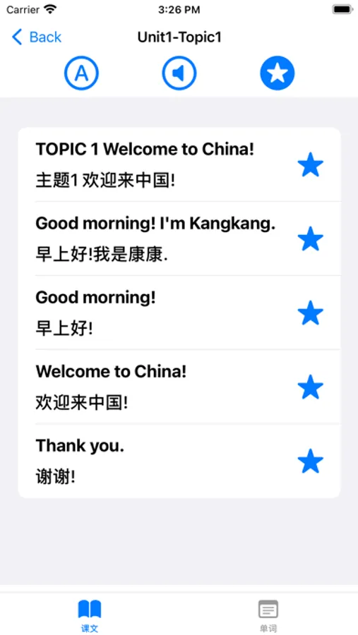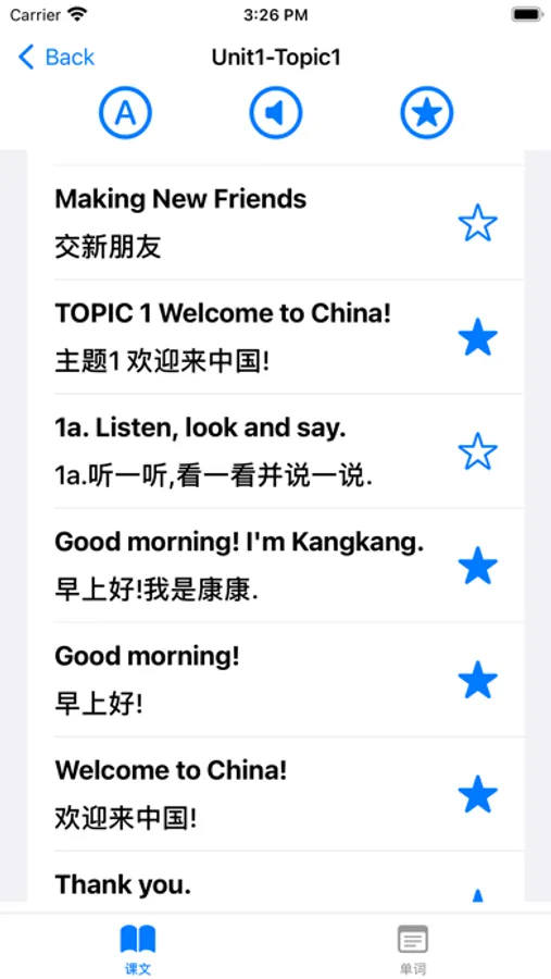 在学习各单元课文时,可以点读课文中的句子,还有中文翻译。