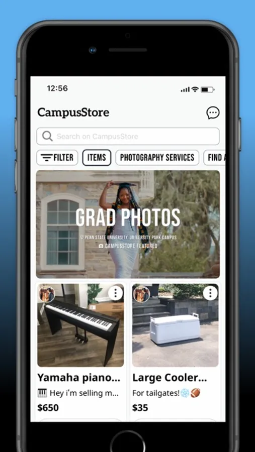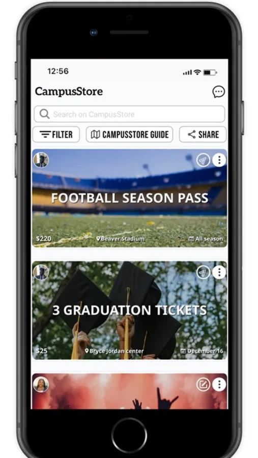 CampusStore allows you to buy and sell items such as Textbooks, iPads, Cameras, Laptops, Guitars, Pianos, Furniture, Games, Clothes, Bicycles, and more, including subletting apartments. Or, see who’s selling tickets to see your favorite artist!