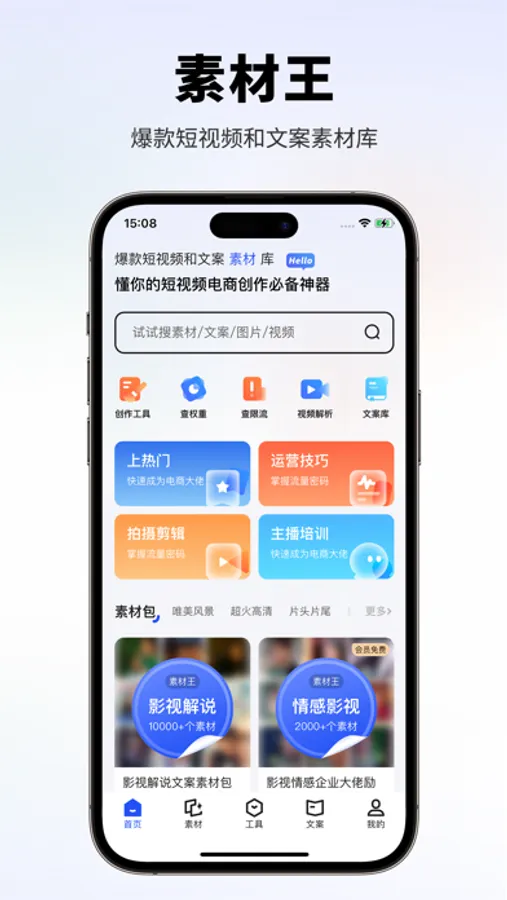素材王是一款短视频创作者的一站式服务的工具APP,短视频创作者必备的口袋素材大全,软件收录了大量的无水印高清视频素材、炫酷的视频特效、众多的BGM音效和背景音乐、视频配套文案、各类素材模板。App同时还提供各种实用工具,如短视频一键提取,视频文案一键提取、一键查询账号权重限流、一键保存高清视频、图片、音频、文案、修改短视频Md5等工具。除此之外还有实战上热门,运营推广技巧,拍摄剪辑教学,主播培训等教程,无论你是视频剪辑入门新手还是剪辑大师都能轻松上手,快来加入素材王快来制作属于你的热门短视频吧!