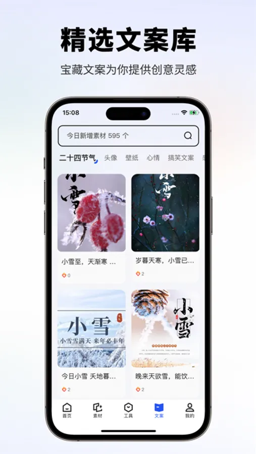 5000+唯美文案:在文案工具中,提供多种场景的文案大全,图文并茂,让您的创作更具创意。