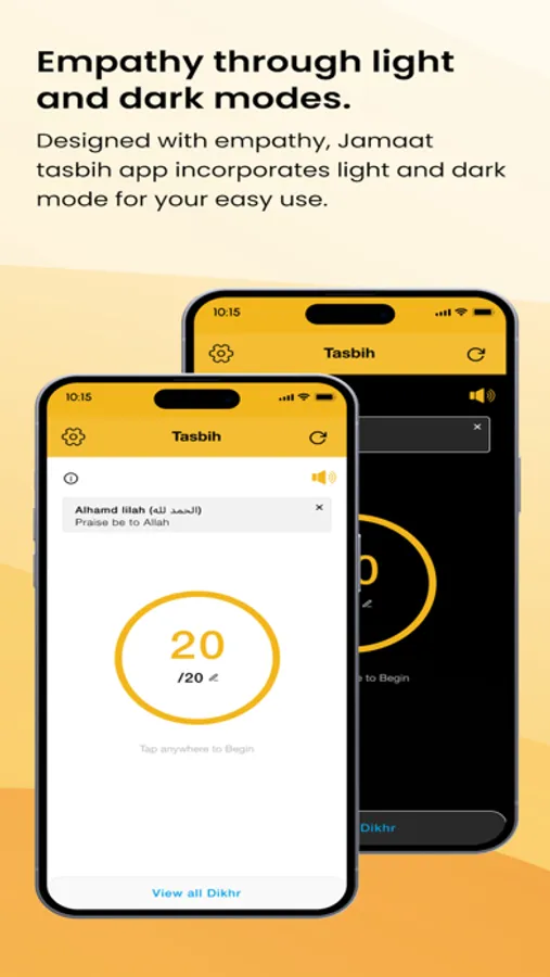 2. Dark/Light Mode: With our app, you can personalise your experience with a choice of visually pleasing Dark or Light mode, ensuring optimal readability and comfort in any lighting condition. This feature helps you to stay focused while engaging in Tasbih, by minimising any distractions.