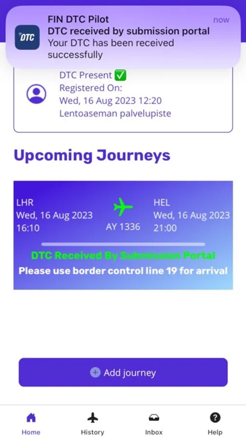 3. Send the information with the app to the Finnish Border Guard 36-4 hours before your flight. Use the DTC at Helsinki-Vantaa airport for border control. Take your passport with you on your journey.