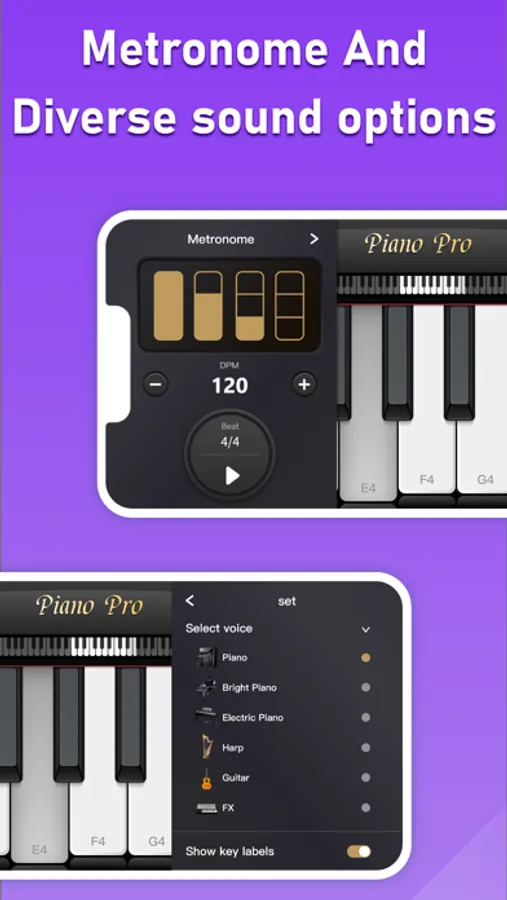 Enhance your musicality with Piano Pro's powerful built-in metronome. This high-precision tool assists you in playing with precise timing, making it an invaluable asset for any pianist.