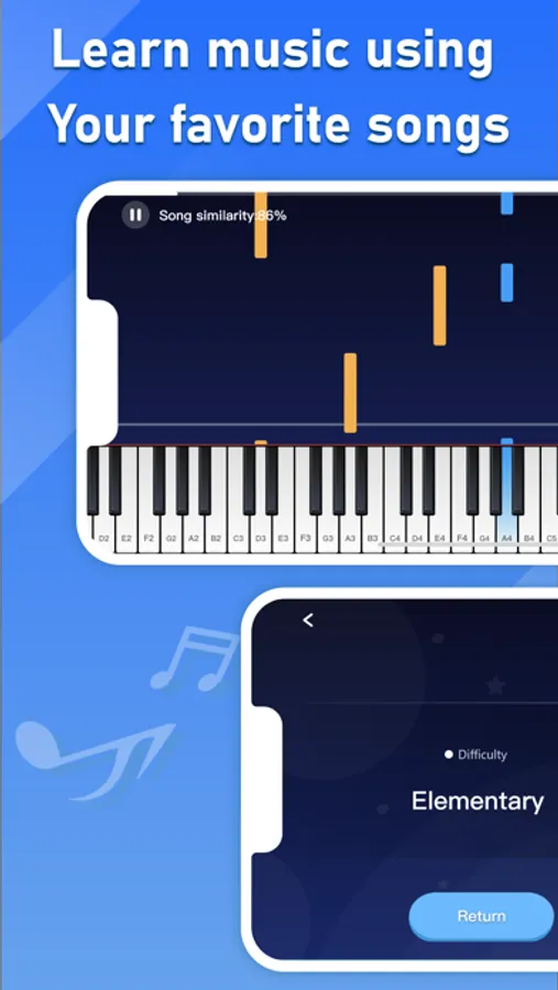 Discover a vast library of practice tracks presented in a visually appealing waterfall-like format. Follow the notes displayed on the keyboard and improve your skills through enjoyable play-along sessions.