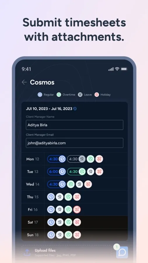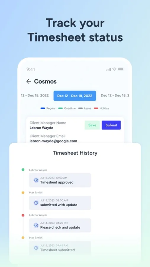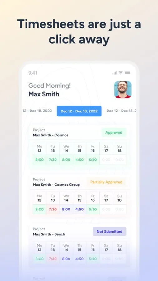 Timesheet App tracks employees’ time and efforts in all their assigned projects, with real-time status updates.
