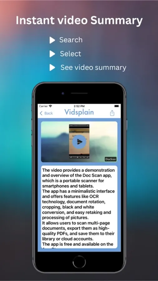Vidsplain gives you a brief explanation of videos you are interested in. Just search for relevant videos, select the one you want, and vidsplain will then process the video and present a summary of the contents of the video. You can then decide to watch the Tube video or instead go back and search for different videos instead.