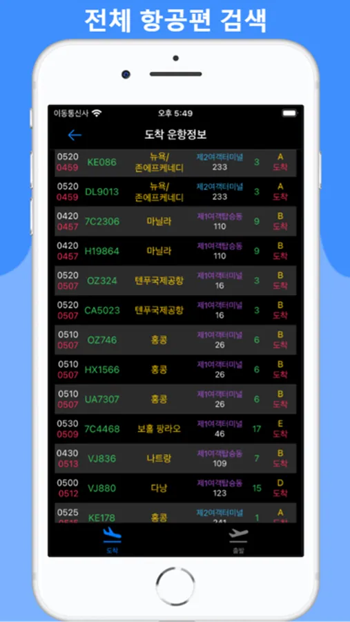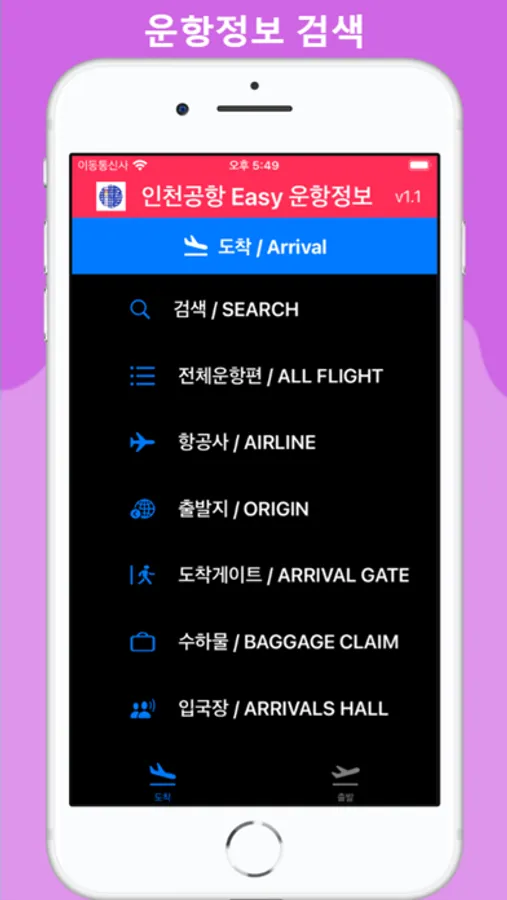 본 앱은 인천국제공항공사(IIAC)에서 제공하는 OPEN API를 이용하여 항공기 출발 도착정보를 다양하게 가공하여 실시간으로 보여 줍니다 API는 전체적으로 당일 정보만 제공하므로 이외의 정보는 인천공항 공식 앱이나 홈페이지를 이용하시기 바랍니다 그외에 구글, 네니버 항공편명 정보와 AREX 공항철도 정보와 공항리무진 정보도 제공하고 있습니다