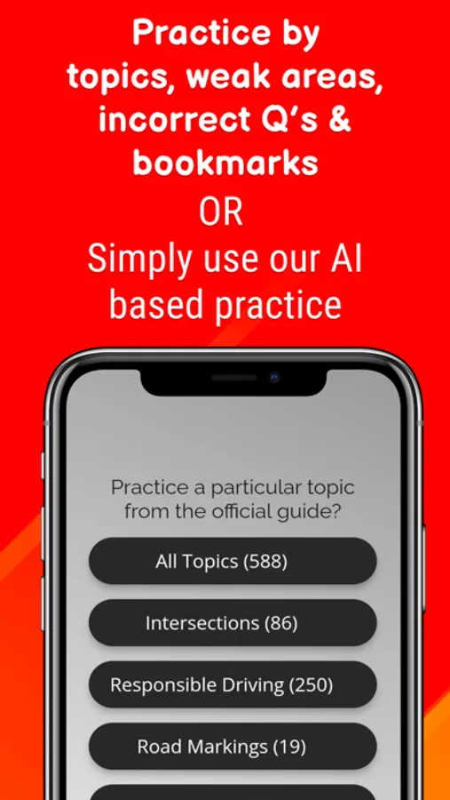 Whether you're a new driver or just need a refresher, our driving test practice app with personalized AI learning is the perfect tool to help you pass your test with ease. Download now and start studying!