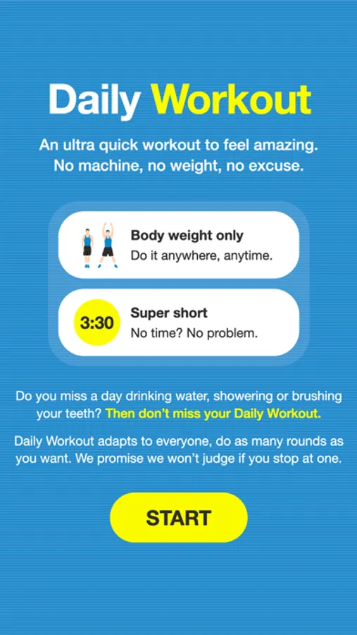 Daily Workout is a super quick body weight workout for your everyday routine.3:30 minutes is all you need, no weight or machine required. Your body and mind will thank you!