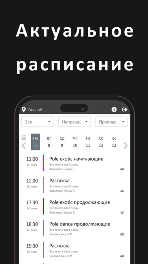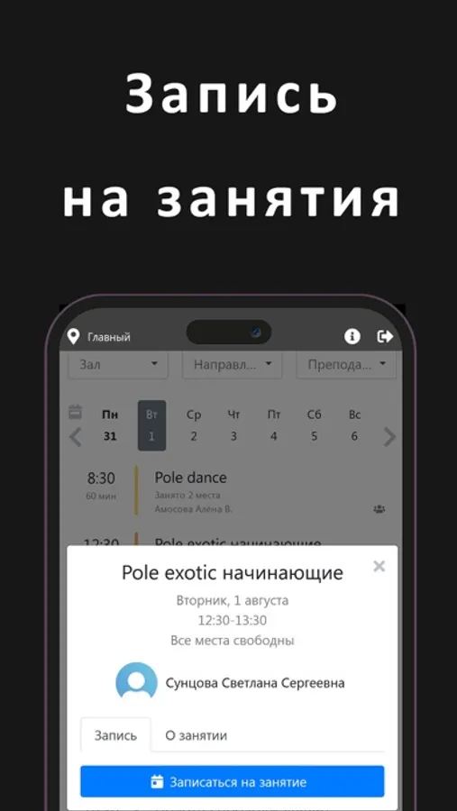 С помощью приложения вы сможете смотреть расписание, записываться на занятия, отслеживать действующий абонемент и свои посещения в CrazyPole.