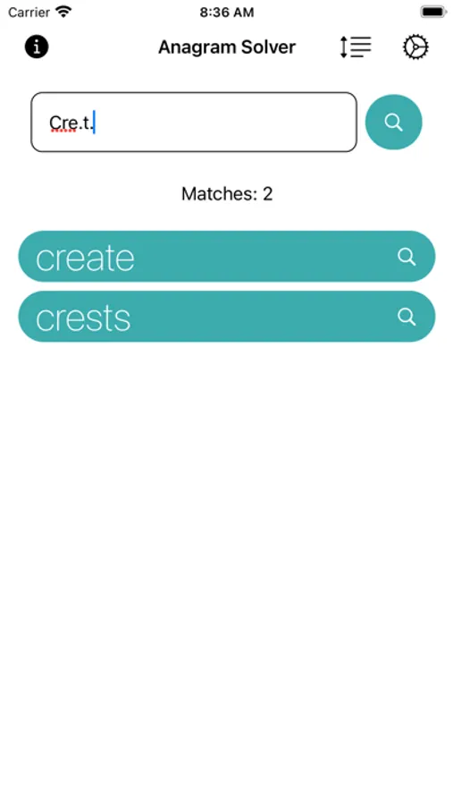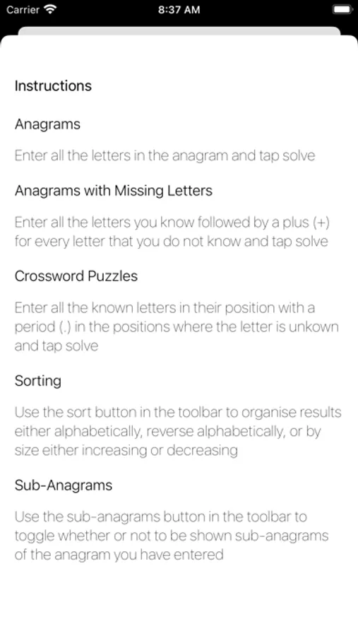 This app allows you to solve anagrams where all of the letters are known, some of the letters are known, or crossword anagrams where some letters and their positions are known.