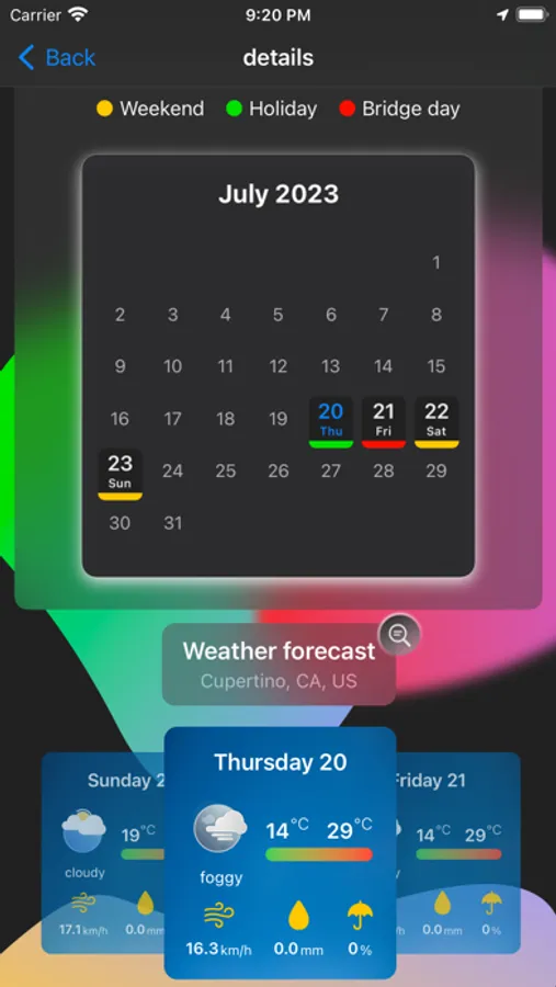 In addition to presenting long weekend information, this app offers a built-in weather forecast feature. You can check the weather predictions specifically for the upcoming weekends, enabling you to make informed decisions about your outdoor plans and activities. Whether it's a weekend getaway, a camping trip, or a simple family picnic, knowing the weather in advance helps to prepare adequately and ensure a memorable experience.