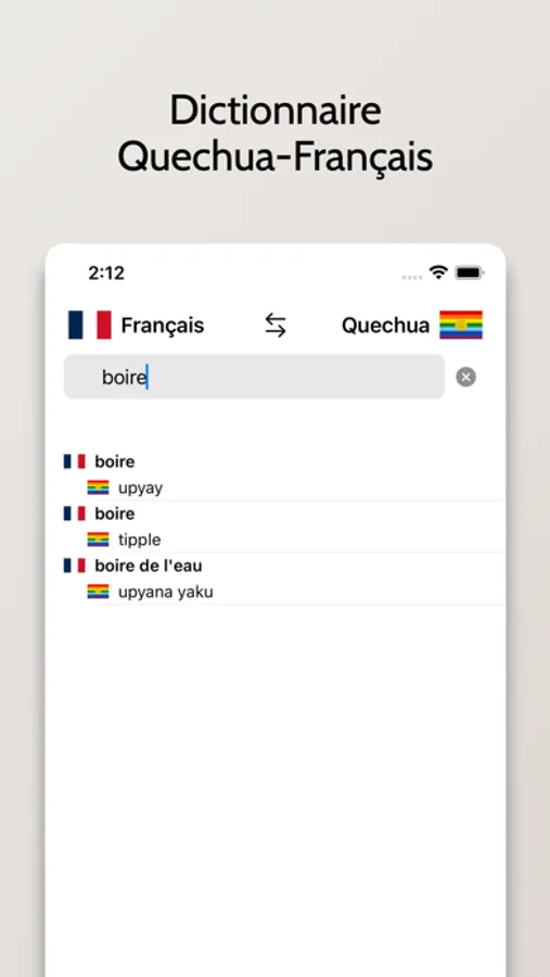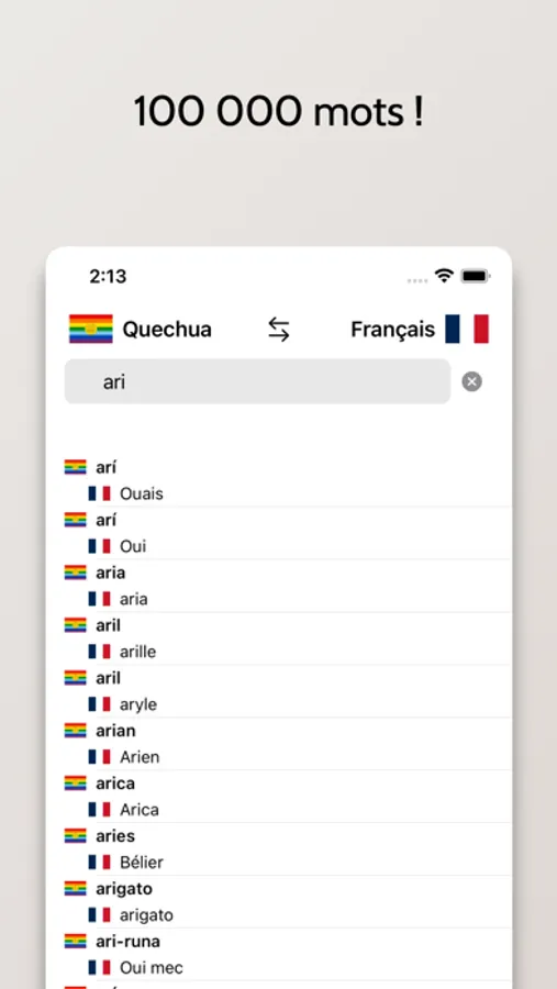 - Possibilité de rechercher à partir de mots en Français ou en Quechua