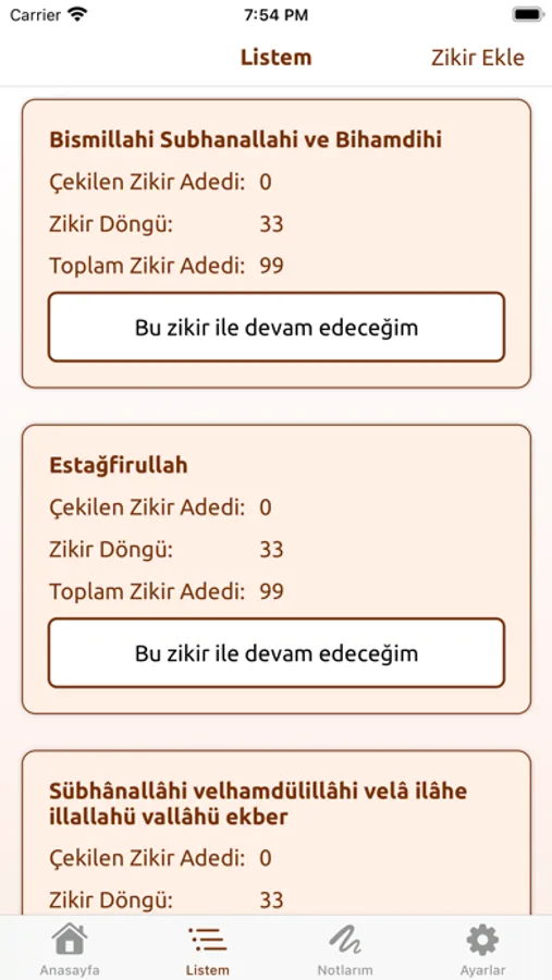 Bu uygulama ile sınırsız sayıda zikir ekleyip , çekebilir, daha sonra kaldığınız yerden devam edebilirsiniz.