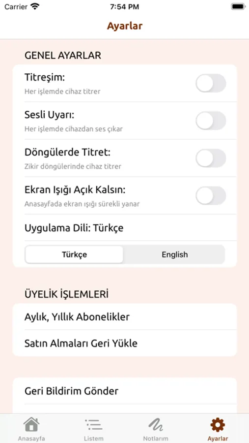 - Ayarlar kısmında ses, titreşim, sürekli ışık modu gibi kişiselleştirmeler yapabilirsiniz.