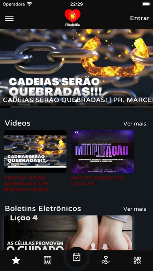 * Conteúdos (Áudio/Vídeo): Permite visualizar e ouvir os conteúdos da Igreja disponíveis no App;