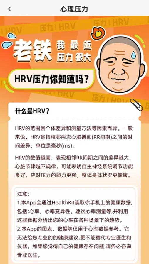 - 解压小橙子 会通过HealthKit 直接读取健康数据中的心率变异性(HRV)进行跟踪记录和分析,让您更直观的了解自己的身体状态。
