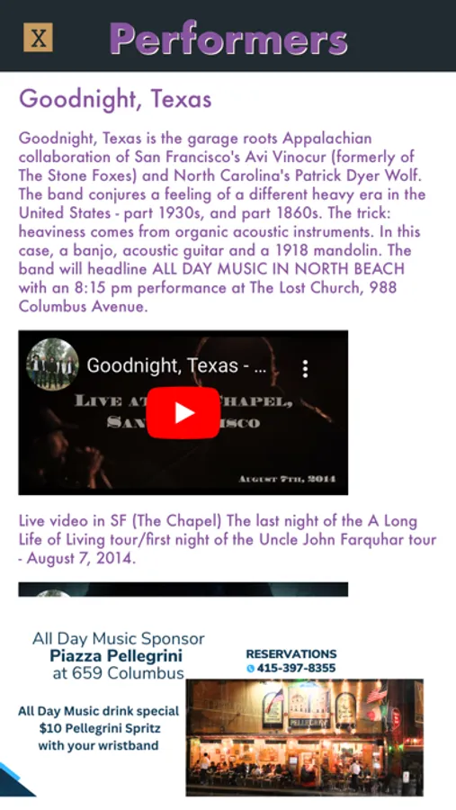 Eighteen performances at seven venues will bring national touring band “Goodnight, Texas” as the headliner, joining local emerging talents such as Cardboard People, Richie Cunning, Kindred, Rahiti Polynesian Dance, plus established jazz artists including the Brian Andres Quartet. Lion and Dragon groups from Chinatown will add their distinctive spectacle. Student musicians from Ruth Asawa School Of The Arts (SOTA) and The Urban School are the featured afternoon performers at one of the venues. In the tradition of “stroll-worthy” music venue downtowns such as Austin, New Orleans, Memphis and the like -- All Day Music in North Beach is being held mostly in the iconic clubs, bars and restaurants in the neighborhood. Specifically, the presenters are The Lost Church, Piazza Pellegrini, Lyon and Swan, The Savoy Tivoli, Libreria Pino, Club Fugazi, and Vesuvio Café.