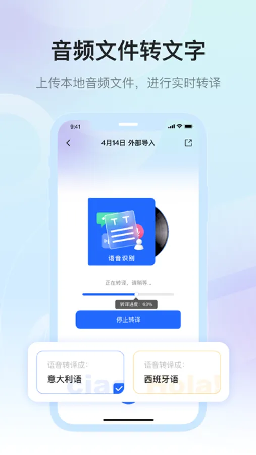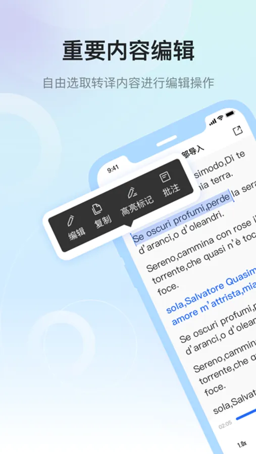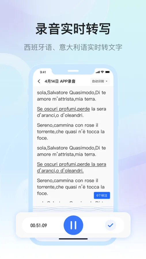 意大利语、西班牙语实时转文字,可对转译内容进行编辑、标注、高亮等操作