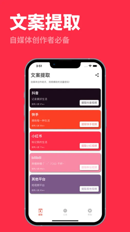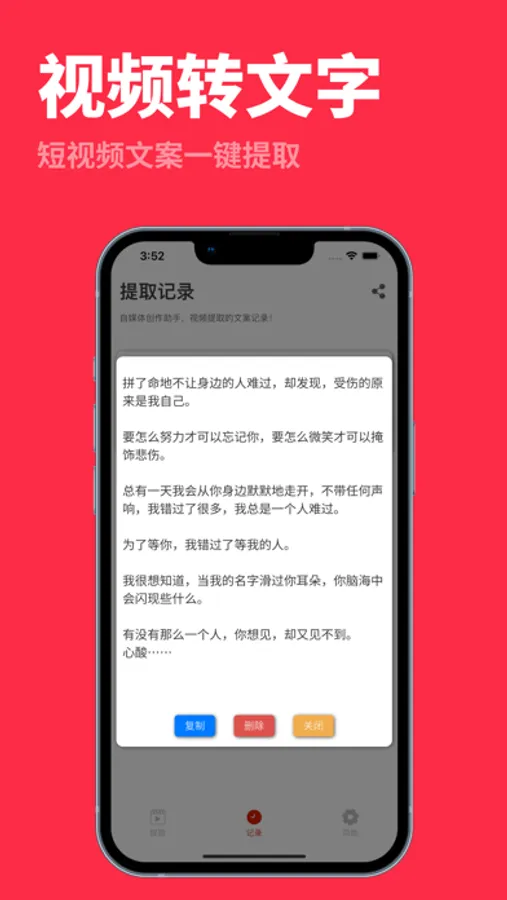 文案提取是一款为短视频自媒体创作者设计的工具,用户只需要将视频上传之后,即可精确的提取出视频中的台词文案并存储记录。文案提取会自动识别视频中的语言,极速精确转换成文本。是自媒体创作者分析竞品,借鉴参考文案,二次创作的必备神器,简单而高效。