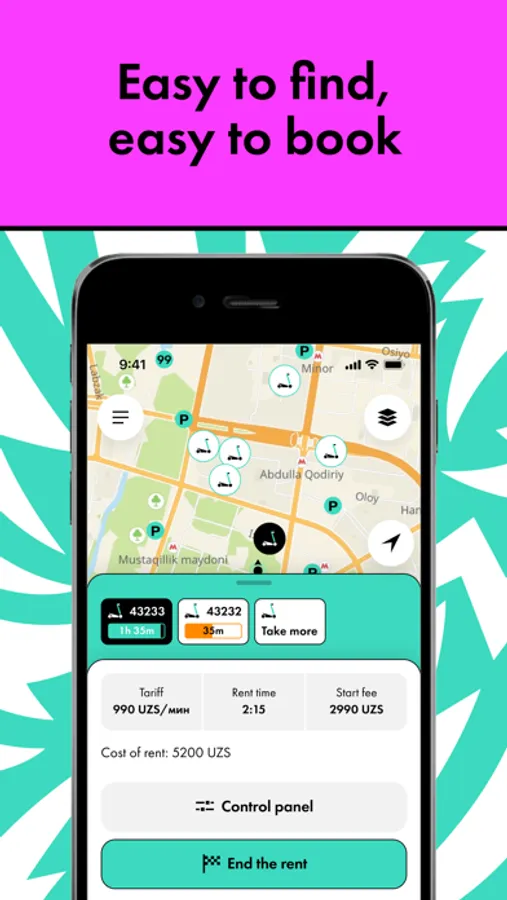 Download the application, sign up using your phone number and right after 2 minutes go hit the road. The map helps you to find the nearest scooter, all you need to do is scan a QR code. Leave the scooter in an accessible place following in-app guide to finish your ride.