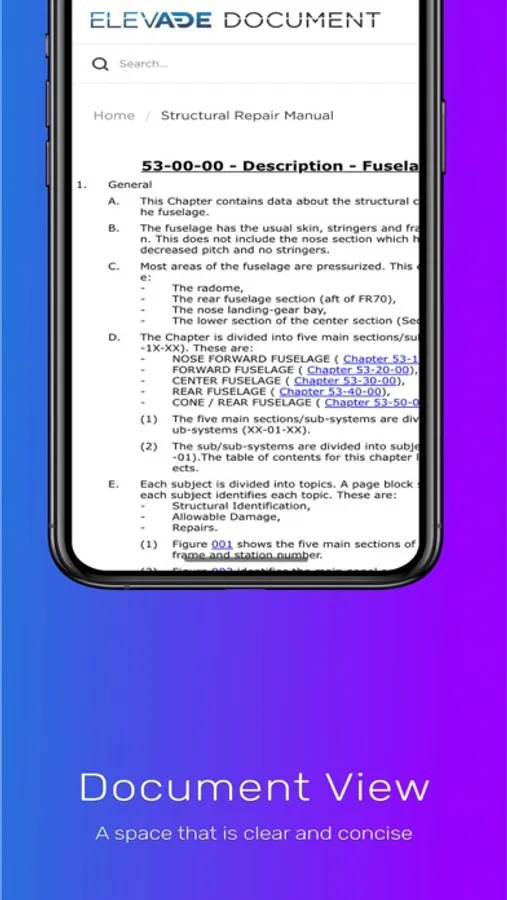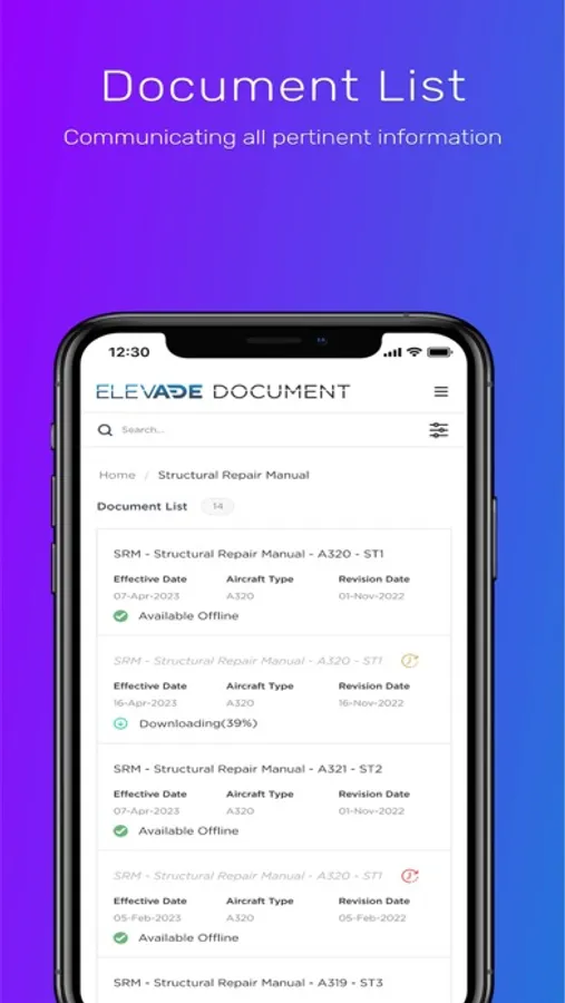 ELEVADE-DOC (ELEVADE Document) is a document and record management system for electronic flight bag (EFB) and aviation engineering manuals. It allows users to view and search manuals, as well as create and manage custom document collections. The app also supports offline viewing, so users can access their manuals even when they are not connected to the internet.