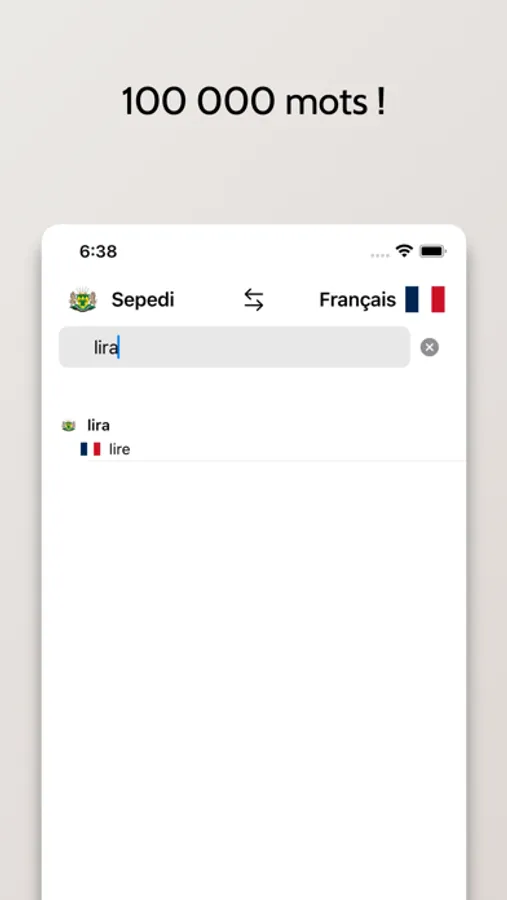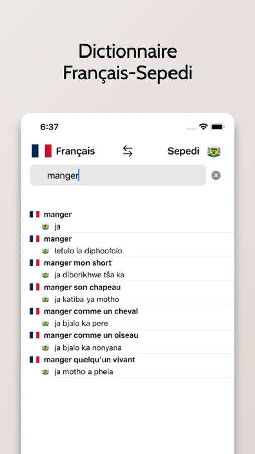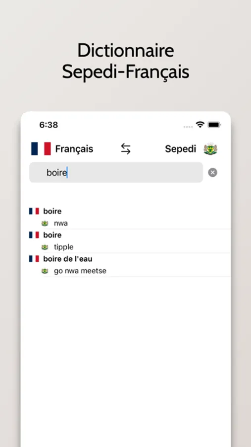 - Possibilité de rechercher à partir de mots en Français ou en Sepedi