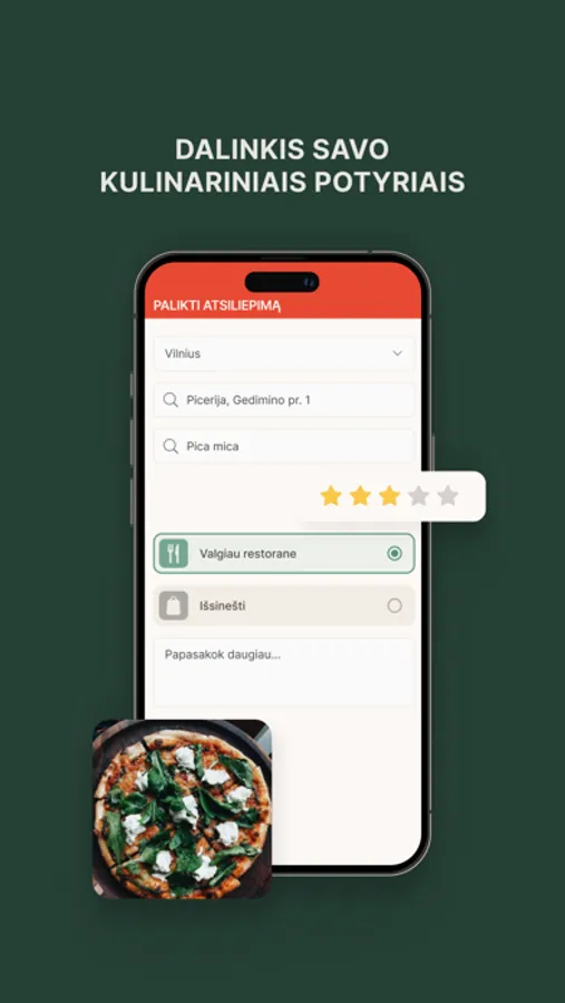 • Save your favorite dishes: Keep your favorite meals in one place, so you never forget that amazing pizza you once had at that pizzeria.